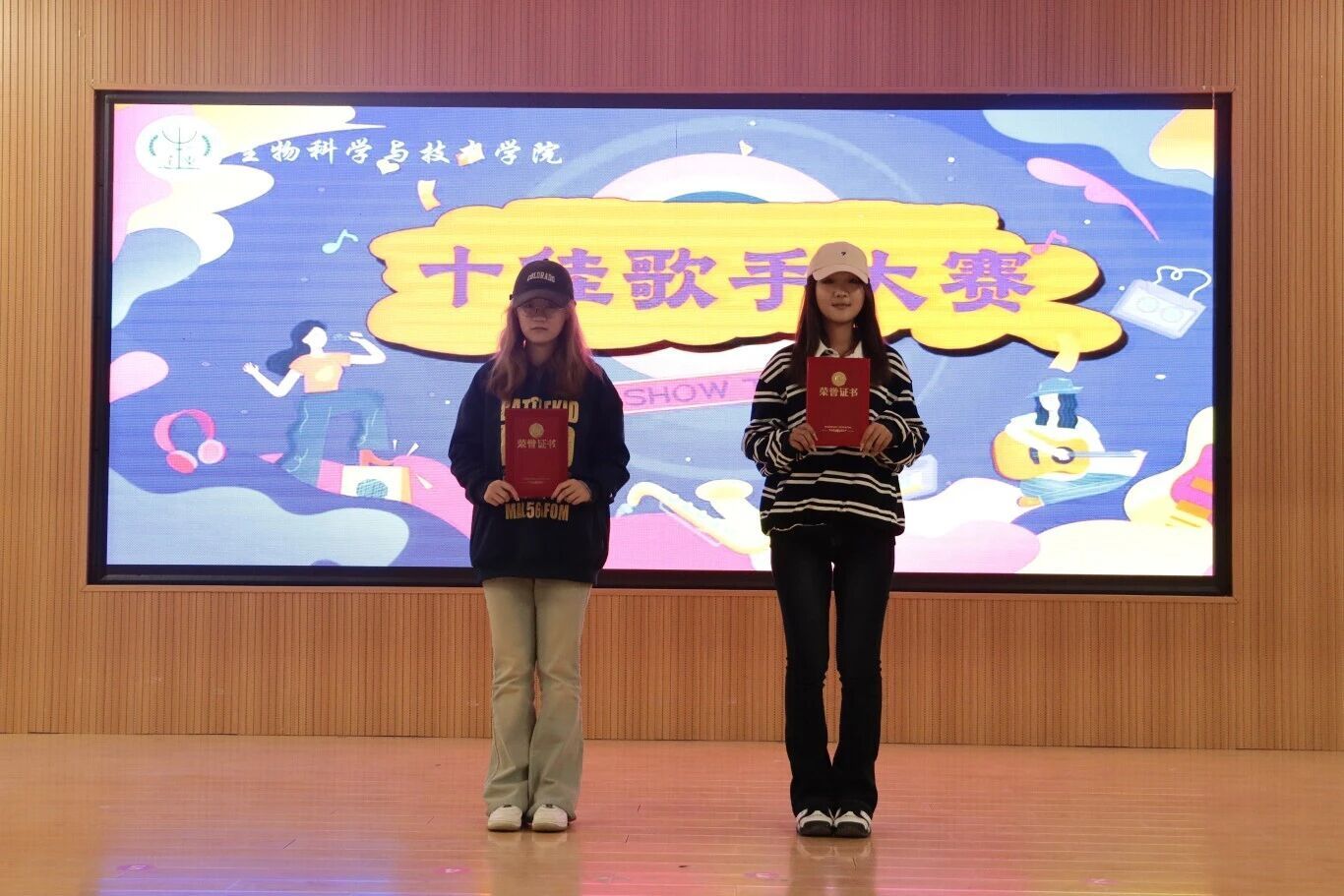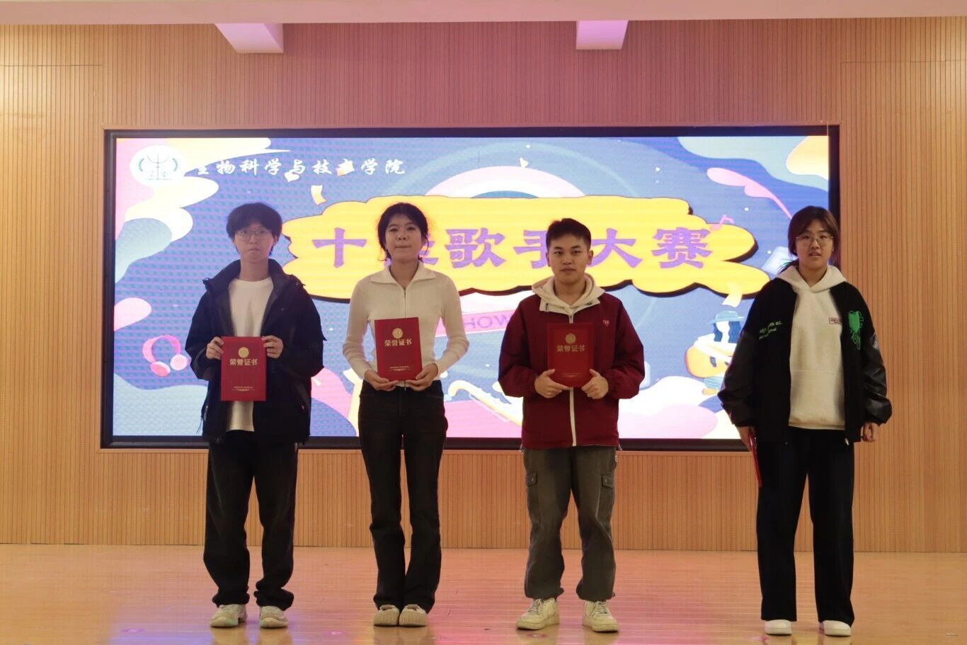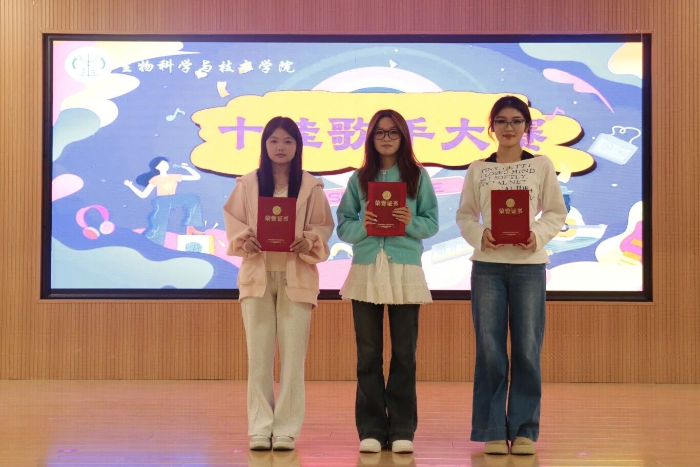 舞台上,选手们依次亮相,倾情演绎,歌声或激昂高亢,或温柔细腻,充分展现了生科学子的艺术才华和青春风采。他们用动人的旋律和深情的演唱,将每首歌曲的情感表达得淋漓尽致,让每一位观众都深深沉浸在音乐的魅力中,现场掌声、欢呼声此起彼伏,一次次将比赛氛围推向高潮。