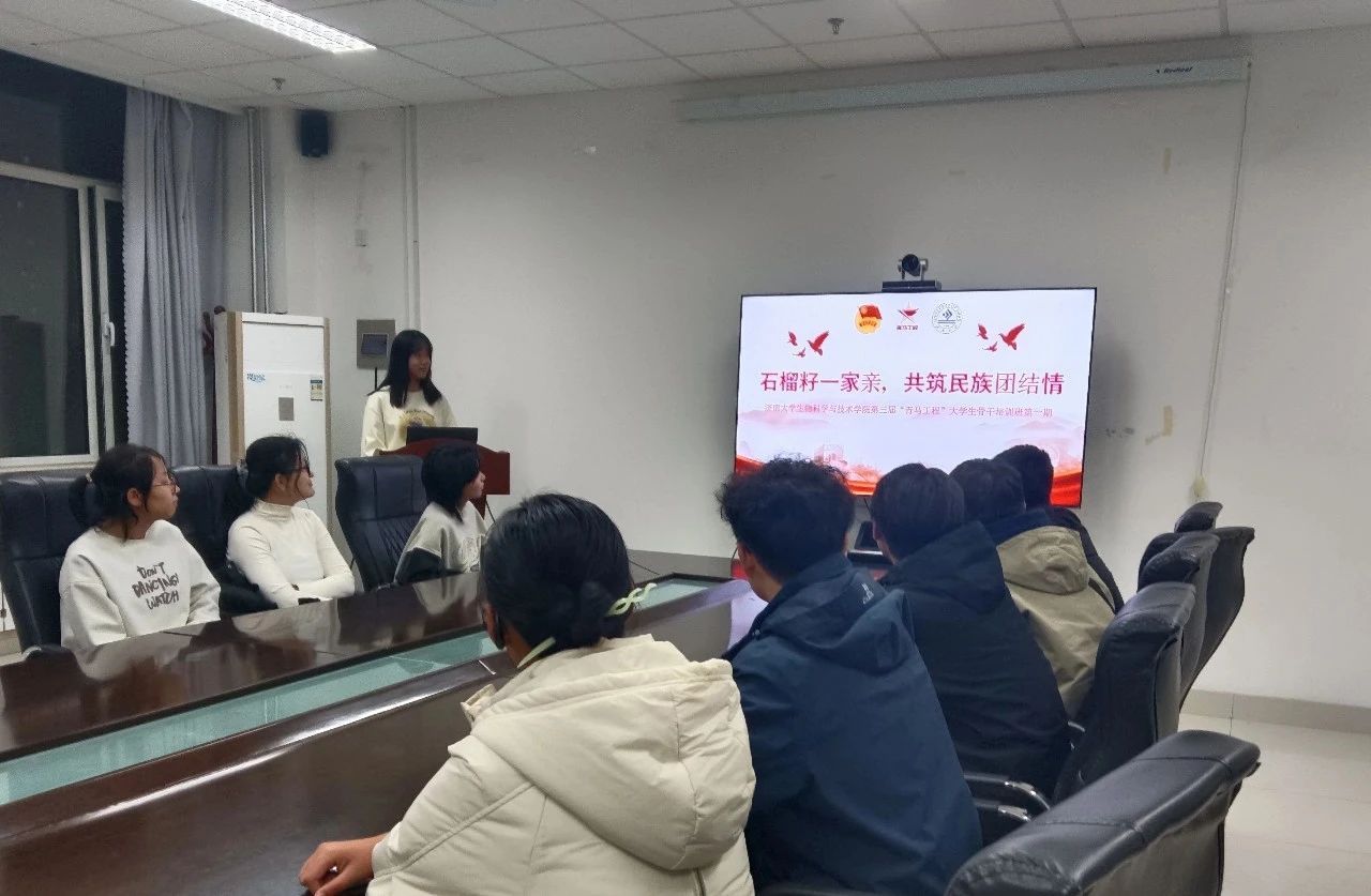 近期成功举办了“石榴籽一家亲,共筑民族团结情”主题活动,本次主题活动是学院第三届"青马工程"大学生骨干培训暨主题团课之一。活动由团务部副部长张锦泽担任主讲。