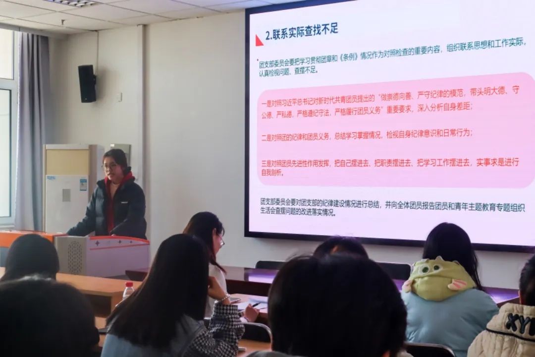 汇报人赵一霏对“召开组织生活会和开展团员教育评议工作”进行培训,围绕“会前准备”“会议召开”“会后工作”“会议要求”四个方面全面介绍了团干部会议召开流程,要求他们积极组织团员开展学习、联系实际查找不足、总结梳理与筹备,提前安排会议形式与议程,在会后实事求是地向每位团员提出建议,并作出材料归档。
