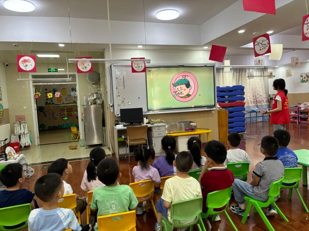 活动伊始,志愿者们以"魔法提问"的趣味形式,循循善诱,引导小朋友们深入思考,开启科学思维启蒙之旅。在播放科普短片《细胞王国大冒险》的过程中,志愿者们巧妙穿插互动提问,不仅加深了与孩子们的交流,更在潜移默化中培养了他们的健康意识,激发无限创造力。