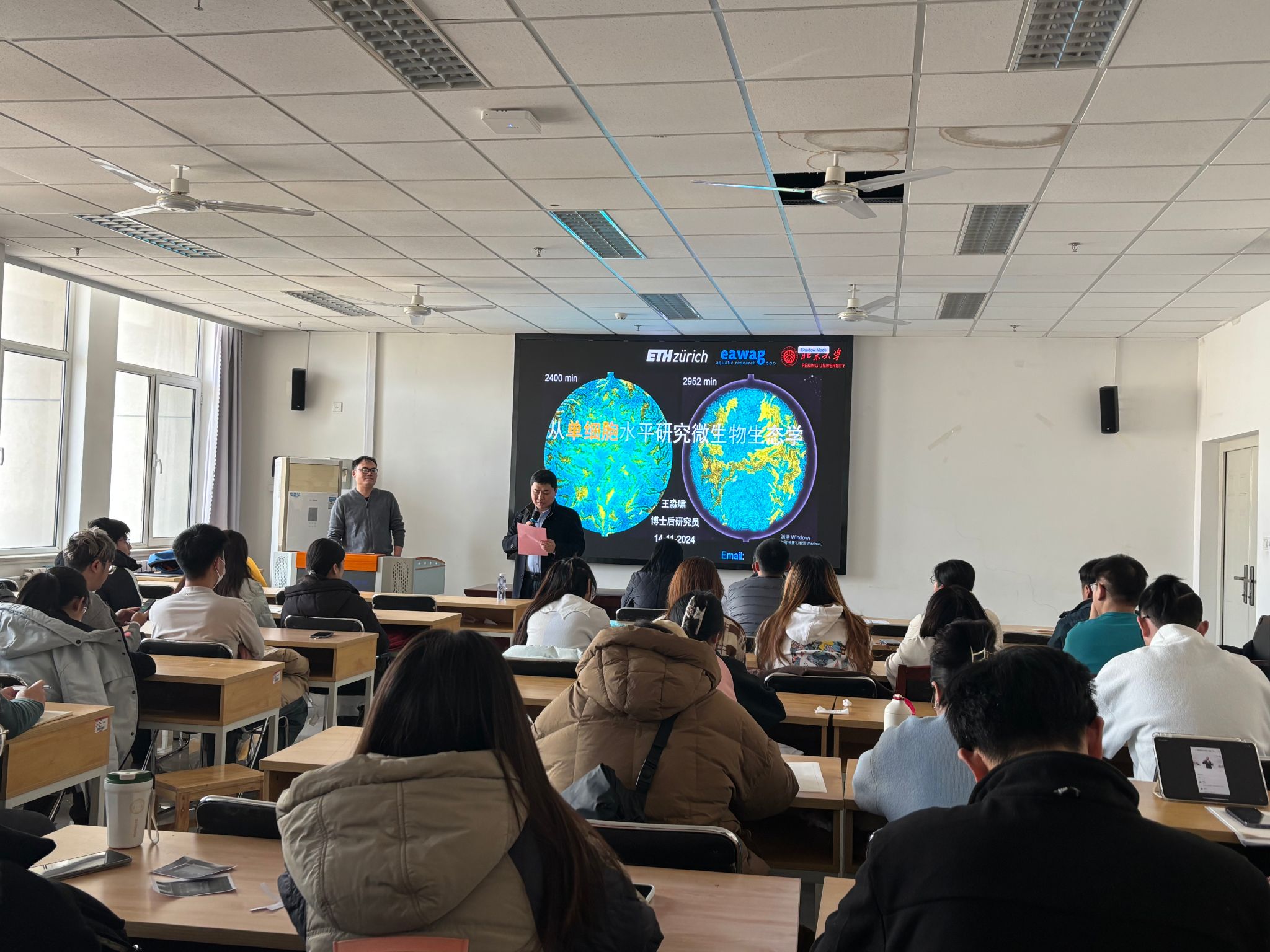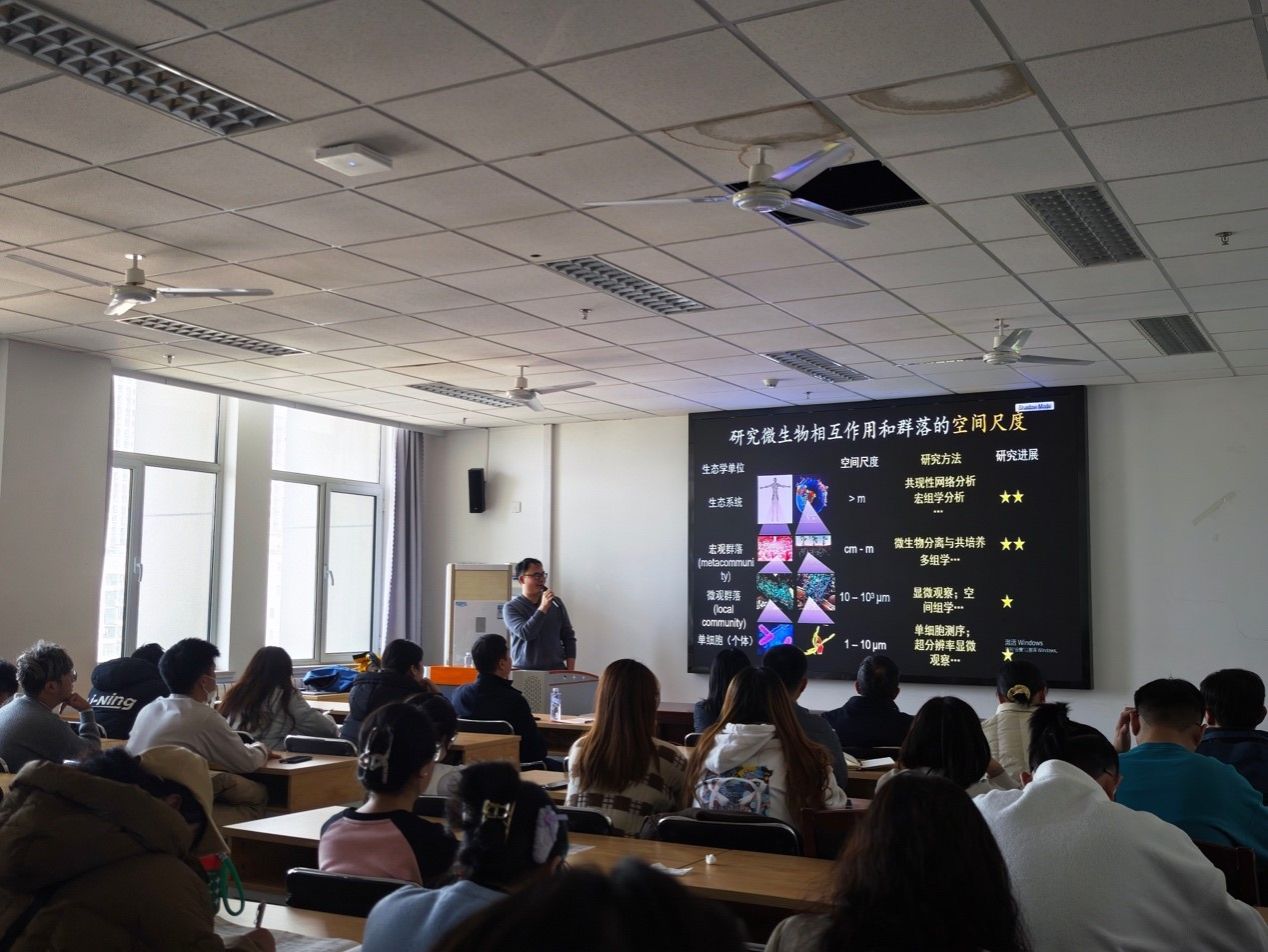 开展学术交流,并以“从单细胞水平研究微生物生态学”为题作学术报告。学院班子成员,教师代表,研究生、本科生代表参加活动。报告会由学院副院长李强主持。