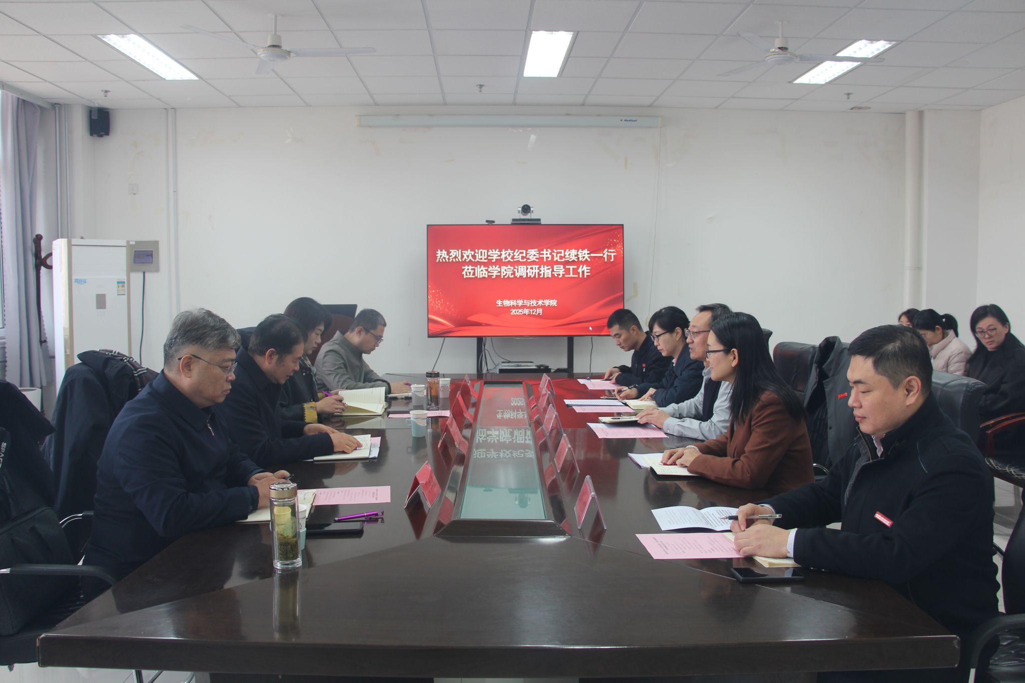 续铁书记对学院在党建与业务深度融合、学科建设、人才培养等方面取得的成绩给予充分肯定。在集体廉政谈话环节,续铁结合高校工作实际,对班子成员提出以下三点要求:一要提高政治站位,扛牢全面从严治党主体责任。深入学习贯彻党的二十届四中全会精神,抓实教师党员教育管理和师德师风建设,严格落实“一票否决”制,对失范行为“零容忍”,确保队伍纯洁可靠;二要强化理论学习,巩固拓展深入贯彻中央八项规定精神学习教育成果。领导班子成员要带头学、深入学、系统学,坚持不懈用习近平新时代中国特色社会主义思想凝心铸魂;三要强化作风建设,持续营造风清气正、干事创业的良好氛围。聚焦立德树人的根本任务和学校学院的发展目标,进一步展现新气象,实现新作为。在学科建设上追求卓越,在人才培养上精益求精,在科研创新上勇攀高峰,在社会服务上再建新功,为学校高水平大学建设做出贡献。